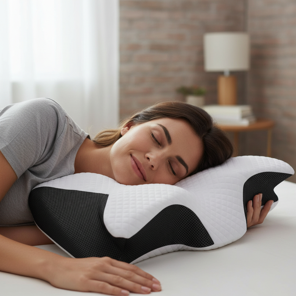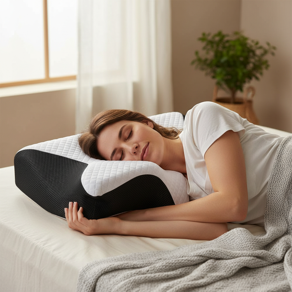 O Travesseiro Cervical Ergonômico 5 em 1 foi desenvolvido para manter o pescoço e a coluna corretamente alinhados durante o sono, ajudando a reduzir dores cervicais, tensão nos ombros e desconfortos ao acordar.